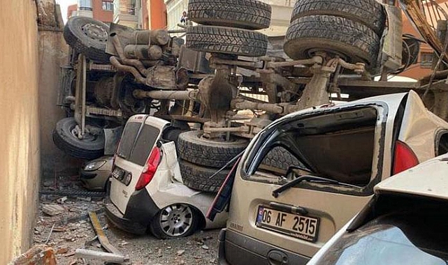 Ankara'da, 5 metre kot farkı olan binanın otoparkına devrilen beton mikseri ile altında ezilen 2 hafif ticari araç ve 1 otomobil, hurdaya döndü.