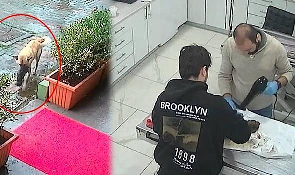 Beylikdüzü'nda bir sokak köpeği soğuktan bitkin düşen yavurusunu ağızında taşıyarak veteriner kliniğinin önüne getirdi. Anne köpek donmak üzere olan yavrusunun tedavisi boyunca yanından ayrılmadı. O anlar güvenlik kamerasına yansıdı.