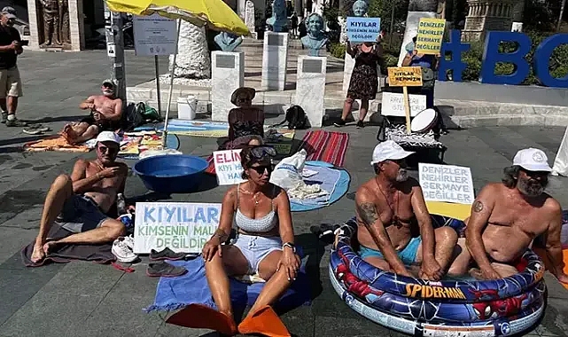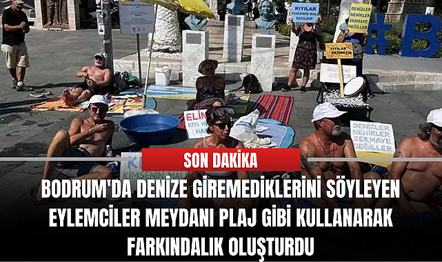 Bodrum'da denize giremediklerini söyleyen eylemciler meydanı plaj gibi kullanarak farkındalık oluşturdu.