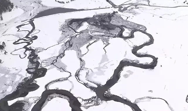 Bolu'da Aladağ bölgesinde karla kaplı alandan geçen menderesler ile yayla evlerinin manzarası dron ile görüntülendi.