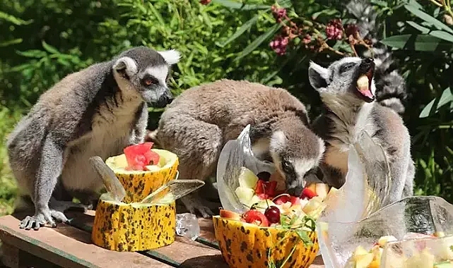 Antalya'da hava sıcaklığının bunaltıcı seviyeye ulaşmasıyla Antalya Büyükşehir Belediyesi Doğal Yaşam Parkı'ndaki hayvanlar, özel yöntemlerle serinletildi. Kavurucu sıcaklıkta hayvanların daha konforlu bir gün geçirmesi için buzlu meyve kokteylleri, fıskiyeler ve gölgelendirme sistemleri ile önlem alındı. Türkiye'nin en büyük doğal yaşam alanlarından biri olan ve yüzlerce hayvana ev sahipliği yapan Antalya Büyükşehir Belediyesi Doğal Yaşam Parkı'nda, yaz sıcaklıklarının etkisini azaltmak amacıyla çeşitli uygulamalar devreye alındı. Özellikle bozayı, maymun ve lemur gibi türler için hazırlanan karpuz, elma, muz, kiraz ve portakal benzeri meyvelerden oluşan buzlu kokteyller hem besleyici hem de serinletici etki sağlaması amacıyla hayvanlara verildi.Hayvanlar zaman zaman kafeslerinde yer alan havuzlara girerek de serinledi. Parkta sıcaklara karşı kurulan fıskiye sistemleri, doğal gölgelikler ve hayvanların dilediklerinde geçebilecekleri kışlık bölümler sayesinde konforlarının artırılması hedeflendi. Görevliler, lifli gıdalarla birlikte bol sulu meyve ve sebzelerle zenginleştirilen yazlık beslenme programını da uygulamaya başladı.5 TÜRDE BİN 600 HAYVANA EV SAHİPLİĞİ YAPIYORUZ'Antalya Doğal Yaşam Parkı Şube Müdürü veteriner hekim Dr. Aygül Arsun, yaz mevsimiyle birlikte hayvanların sıcaklık stresine girmemesi için önlemler aldıklarını belirterek, "Parkımızda 115 türde 1600 hayvana ev sahipliği yapıyoruz. Özellikle bazı türler sıcaklığa karşı daha hassas olabiliyor. Bu nedenle özel soğutulmuş meyve, sebze ve sıvı veriyoruz. Koyun, keçi, lama gibi türlerde ise tıraş işlemleriyle sıcaklık stresini azaltıyoruz" dedi. HAYVANLARA ÇAMUR BANYOSUBarınaklarda gölgelendirme ve serin alanların kontrol edildiğini belirten Dr. Arsun, "Çamur banyoları da hayvanlar için hem serinletici hem koruyucu etki sağlıyor. Parkın ormanlık yapısı ve doğal su kaynaklarıyla ziyaretçilere de serin bir ortam sunuyoruz. Hayvanların refahı için tüm bakım çalışmalarımızı özenle sürdürüyoruz. Aynı zamanda ziyaretçilerimize doğayla iç içe, öğretici bir deneyim sunmayı amaçlıyoruz" diye konuştu. 'HAYVANLARA ÇOK İYİ BAKILDIĞINI GÖRDÜK'Öğrencilerini, hayvanları tanıması için doğal yaşam parkına getirdiklerini belirten öğretmen Gülşah Uslu da "Öğrencilerimizi hayvanları görmeleri için ve keyifli vakit geçirmeleri için getirdik. Hayvanlara çok iyi bakıldığını gördük. Çocuklar onları görünce çok mutlu oldu. Buzlu meyve kokteylleriyle serinliyorlardı" dedi.