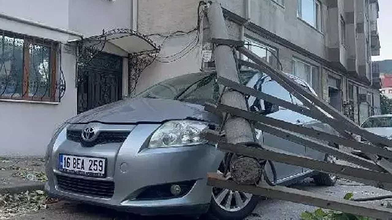 Bursa'da etkili olan lodos nedeniyle aydınlatma direği ve ağaç, park halindeki 2 aracın üzerine devrildi.