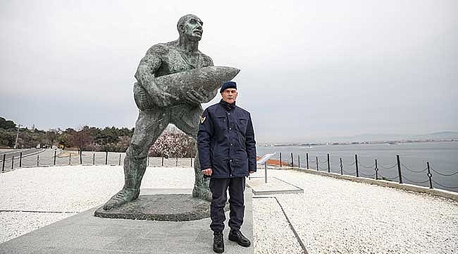 Savaşları'nda sırtladığı ağır top mermisini kundağa yerleştirerek zaferde büyük pay sahibi olan Seyit Onbaşı'nın üçüncü kuşaktan torunu Jandarma Astsubay Kıdemli Üstçavuş Seyit Çabuk, Şehitleri Anma Günü ve Çanakkale Deniz Zaferi törenlerindeki görevi için Manisa'dan geldi.