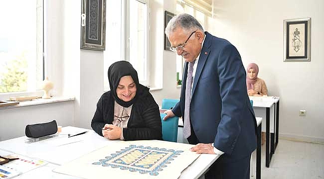 ‘Yüz akımız’ dediği KAYMEK’in Göz Nuru Tesisi’ni ziyaret eden Başkan Büyükkılıç, alanında uzman eğitmenler tarafından çeşitli branşlarda eğitimler verilen sınıfları tek tek gezerek kursiyerlerle sohbet etti. Büyükkılıç ayrıca kursiyerlerin el emeği ürünlerini de inceledi.