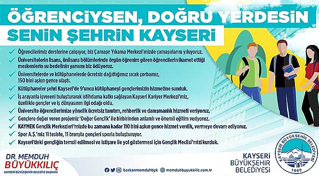 Kayseri Büyükşehir Belediye Başkanı Dr. Memduh Büyükkılıç, üniversite tercihlerinde Kayseri şehrini tercih eden öğrencilerin doğru adreste olduklarını belirterek, “Öğrenciysen doğru yerdesin, senin şehrin Kayseri” dedi.