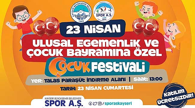Büyükşehir Belediyesi Spor A.Ş.’nin düzenlediği Talas Paraşüt İndirme Alanı’ndaki ‘Çocuk Festivali’nde birbirinden farklı ve eğlenceli etkinlikler ile çocuklar eğlenceye doyacak. Çocuklar için adeta yok yok olan festivalde, şişme basketbol, şişme penaltı, şişme tırmanma alanı, şişme gladyatör, şişme langırt, şişme dart, şişme engelli parkuru, şişme denge oyunu, mini şişme kaydırak, balon futbolu, masa tenisi alanı, voleybol alanı, labirent oyunu, bilek güreşi, moss güreşi, okçuluk alanı, badminton alanı, ahşap oyun alanları, lazer run etkinliği (modern pentatlon), mini maraton etkinliği, paten yarışı, sahne önü oyunları (sandalye kapmaca, çuval yarışı, kapak oyunu, halat çekme), sahne gösterileri (çocuk dansları) ve bando takımı dinletisi ile 7-10 yaş mini maraton, 11-15 yaş mini maraton etkinlikleri gerçekleştirilecek.