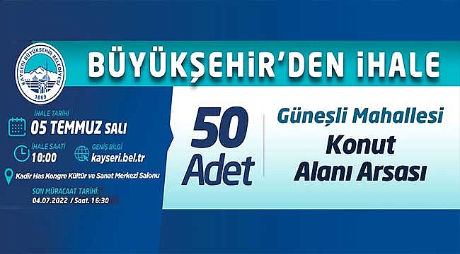 Kayseri Büyükşehir Belediyesi tarafından Kocasinan İlçesi, Güneşli Mahallesi’nde bulunan 50 adet Konut Alanı Arsası “Açık Teklif Usulü” ihale ile ayrı ayrı satışa çıkarılacak. İhale, 5 Temmuz Salı günü saat 10.00’da Büyükşehir Belediyesi Kadir Has Kongre Kültür ve Sanat Merkezi Salonu’nda gerçekleştirilecek.