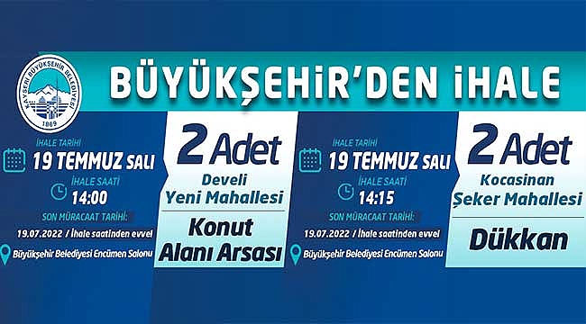 Kayseri Büyükşehir Belediyesi tarafından Develi’de konut alanı arsası ve Kocasinan ilçesinde dükkân “Açık Teklif Usulü” ihale ile ayrı ayrı satışa çıkarılacak.