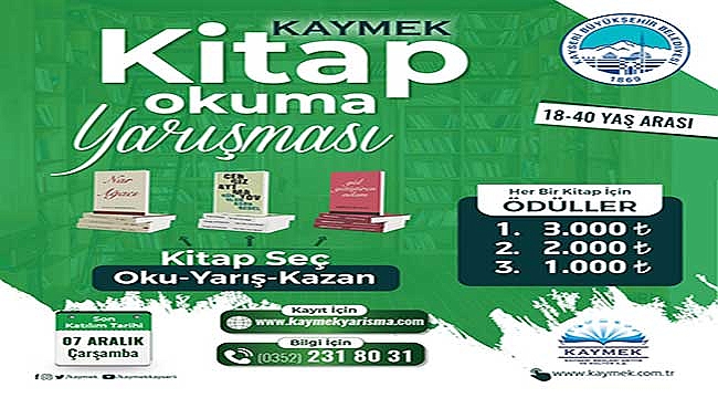 Kayseri Büyükşehir Belediyesi bünyesinde faaliyetlerini yürüten Kayseri Mesleki Eğitim ve Kültür A.Ş. (KAYMEK) vatandaşlara yönelik “Kitap Seç, Oku, Yarış, Kazan” sloganıyla ödüllü kitap okuma yarışması düzenleyecek.