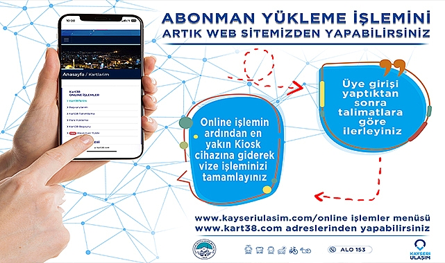 Abonman yükleme işlemi online olarak, http://kart38.com yada http://kayseriulasim.com adreslerinden yapılabilirken, yükleme işleminin ardından en yakın kiosk cihazlarından vize işlemi tamamlanabilecek.