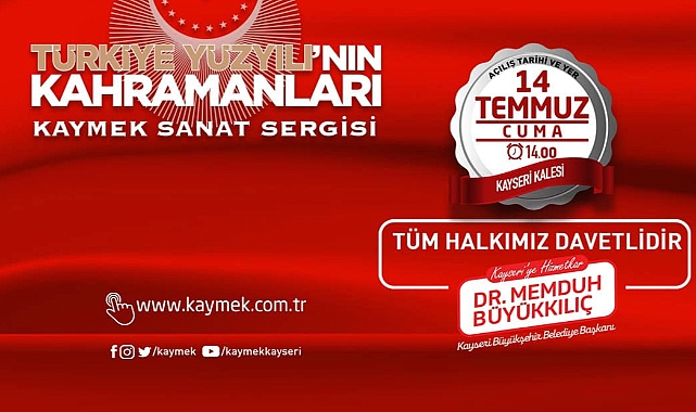 Kayseri Büyükşehir Belediye Başkanı Dr. Memduh Büyükkılıç, 15 Temmuz Demokrasi ve Milli Birlik Günü etkinlikleri kapsamında ‘Türkiye Yüzyılı’nın Kahramanları KAYMEK Sanat Sergisi’ adlı çok özel bir program düzenleyeceklerini duyurdu.Eğitim verdiği kurslarla ve düzenlediği sergilerle sanatı destekleyen ve sanatçının yanında olan Kayseri Büyükşehir Belediyesi bünyesinde faaliyet gösteren Kayseri Mesleki Eğitim ve Kültür A.Ş. (KAYMEK), yeni bir sergiyi daha ziyarete açıyor. Bu kapsamda, KAYMEK düzenleyeceği sanat sergisiyle 15 Temmuz kahramanlarını yâd edecek.Büyükşehir Belediye Başkanı Dr. Memduh Büyükkılıç, konu ile ilgili yaptığı açıklamada, 15 Temmuz 2016’da birlik ve beraberlik ile demokrasiye sahip çıkan aziz milletin kahramanlık ruhunu eşsiz bir sergiyle sanata yansıttıklarını belirtti.KAYMEK tarafından 15 Temmuz ruhunu yansıtan Türkiye Yüzyılı’nın Kahramanları KAYMEK Sanat Sergisi’nin 14 Temmuz Cuma günü halkın beğenisine sunulacağını ifade etti.Sergide birbirinden önemli, el emeği göz nuru 71 eserin sergileneceğini ifade eden Büyükkılıç, “Bu yıl ‘Türkiye Yüzyılı’nın Kahramanları’ teması ile düzenlenecek olan 15 Temmuz Demokrasi ve Milli Birlik Günü dolayısı ile Büyükşehir Belediyesi KAYMEK olarak Türkiye Yüzyılı’nın Kahramanları KAYMEK Sanat Sergisi’ni ziyarete açıyoruz. Sergimizde özellikle Türkiye Yüzyılı’nın Kahramanlarını konu alan Diorama, Yağlı Boya Resim, Ebru ve Filografi gibi birbirinden özel 23 farklı branşta sanatla üretilmiş 71 farklı eseri sizlerle buluşturuyoruz” diye konuştu.