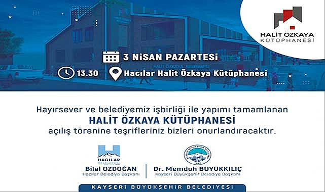 Kayseri’nin şirin ve hayırsever ilçesi Hacılar’da hayırsever merhum Halit Özkaya adına Büyükşehir Belediyesi ile işbirliği olarak yaptırılan Halit Özkaya Kütüphanesi, Başkan Dr. Memduh Büyükkılıç’ın katılımlarıyla 3 Nisan 2023 tarihinde saat 13.30’da resmi olarak açılacak.