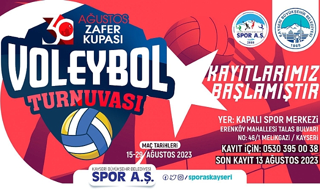 Kayseri’de milli manevi değerleri özellikle genç nesle aşılamak amacıyla hareket eden ve sporu da teşvik eden Başkan Dr. Memduh Büyükkılıç yönetimindeki Kayseri Büyükşehir Belediyesi, 30 Ağustos Zafer Bayramı dolayısıyla 15-29 Ağustos 2023 tarihleri arasında gerçekleşecek ödüllü, Zafer Kupası Voleybol Turnuvası için kayıt almaya başladı.