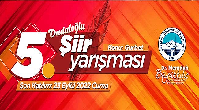 Kayseri Büyükşehir Belediye Başkanı Dr. Memduh Büyükkılıç, kültür sanat etkinlikleri kapsamında her yıl geleneksel olarak düzenlenen şiir yarışmasının beşincisinin bu yıl ‘Dadaloğlu’ temasıyla düzenleneceğini ve başvuruların 20 Haziran’da başlayacağını duyurdu.