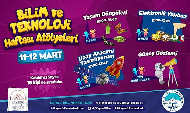 11-12 Mart tarihlerinde Anadolu Harikalar Diyarı içerisinde yer alan Kayseri Bilim Merkezi’nde düzenlenecek atölyelerde çocuklar hem eğlenecek hem de öğrenecek. Bilim ve Teknoloji Haftası Atölyeleri için 15 kişilik kontenjan ayrılırken saat 10.00 ile 10.45 arasında gerçekleştirilecek Yaşam Döngüleri Atölyesi’ne 7-9 yaş, 11.00 ile 11.45 arasında gerçekleştirilecek Elektronik Yapboz Atölyesi’ne 8-11 yaş, 12.00 ile 12.45 arasında gerçekleştirilecek Uzay Aracımı Tasarlıyorum Atölyesi’ne ise 6-8 yaş arası çocuklar katılabilecek.