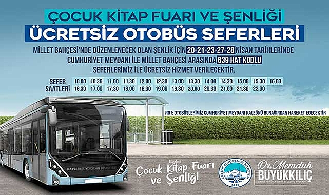 Recep Tayyip Erdoğan Millet Bahçesi etkinlik alanında 19-28 Nisan günleri arasında yapılacak, 20 Nisan Cumartesi günü resmi açılışı gerçekleşecek olan Kayseri Çocuk Kitap Fuarı ve Şenliği için Büyükşehir Belediyesi ücretsiz ulaşım imkânı sağlayacak.