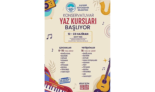 Kayseri Büyükşehir Belediyesi’nin merakla beklenen konservatuvar yaz kursları kayıtları 12 Haziran’da başlayacak.