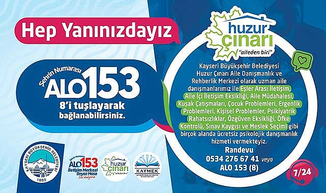 Kayseri Büyükşehir Belediyesi, ihtiyacı olan vatandaşlara şehrin numarası Alo 153 Çağrı Merkezi’ni arayıp, 8 menüsünü tuşlayarak, uzman aile danışmanları ile 12 farklı alanda ücretsiz psikolojik danışmanlık hizmeti veriyor.