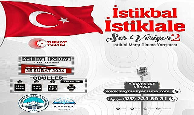 Kayseri Büyükşehir Belediyesi Kayseri Mesleki Eğitim ve Kültür A.Ş. (KAYMEK) tarafından 12 Mart İstiklal Marşı’nın kabulü konusunda ‘İstikbal İstiklale Ses Veriyor’ sloganıyla İstiklal Marşı Okuma Yarışması’nın ikincisi düzenleniyor. Başvuru için son gün 25 Şubat olan yarışmada, Türkiye Yüzyılı’nda İstiklâl Şairi Mehmet Akif Ersoy’un dizelerinde hissedilen milli ve manevi ruhu yansıtmak ve yaşatmak amaçlanıyor.