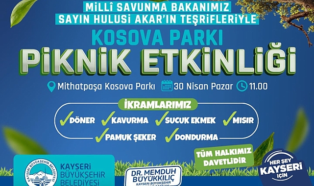 Büyükkılıç, birliğin, beraberliğin ve dayanışmanın en güzel örneklerini sergilediklerini belirterek, “Mithatpaşa Kosova Parkı’nda Piknik Etkinliği düzenliyoruz. Milli Savunma Bakanı Hulusi Akar’ın teşrifleriyle 30 Nisan Pazar günü saat 11.00’de gerçekleşecek etkinliğimize tüm halkımız davetlidir” dedi.