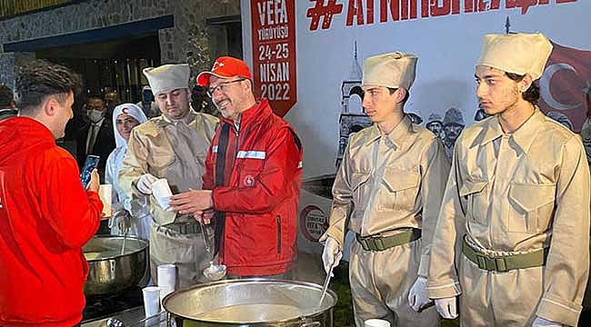 Çorba dağıtımı sırasında konuşan Gençlik ve Spor Bakanı Dr. Mehmet Muharrem Kasapoğlu, “Çanakkale Savaşları'nın 107'nci yılında 57'nci Alayı yad etmek üzere Vefa Yürüyüşü için bir aradayız. Çanakkale Ruhunu, 57'nci Alay'ın o fedakarlığını diri tutmak, önemli misyonlarımızdan bir tanesi. Nasıl Sarıkamış'ta, Zafer Tepe'de, Dumlupınar'da var isek, ülkemizin dört bir yanından gelen gençlerimizle birlikte her yıl 57'nci Alay Vefa Yürüyüşünde bir aradayız. Bu ruhu diri tutma ve kutsal emaneti yarınlara güçlü bir şekilde taşıma adına buradayız. Gençlerimizin tarih bilincini, vefa duygusunu diri tutma adına buradayız. Şükürler olsun her daim gençlerimizle birlikte bu çalışmalarımızın ne kadar anlamlı ve ne kadar gençlerimiz açısından heyecan verici olduğunu görüyoruz ve bu gece gençlerimizle Çanakkale'deki kamp alanımızda buluşmanın sevinci içerisindeyiz. Ramazan'ın ruhuna uygun bir buluşmayı da gerçekleştiriyoruz. Az önce sahur ikramımızı gençlerle birlikte paylaştık. Biraz sonra yürüyüşümüze başlayacağız. Hakikaten ecdadımızın bize emanetini hem güçlü bir şekilde yarınlara taşıma adına onun bilinci ile yaşamaya gençlerimiz ile birlikte devam edeceğiz. Bu vesile ile tüm şehitlerimizi, gazilerimizi, Çanakkale'nin tüm kahramanlarını, Gazi Mustafa Kemal Atatürk ve silah arkadaşlarını rahmetle, minnetle yad ediyorum" diye konuştu. Ardından, Kur'an-ı Kerim Tilaveti yapıldı ve çifte ezan okundu. 107 yıl önce şehit olan askerler gibi sabah namazı kılındı. Bakan Kasapoğlu ve katılımcılar, 57. alay Yürüyüşü'ne başlamak için Kocadere Kamp Alanı'na hareket etti.GELİBOLU YARIMADASI'NDA TARİHİ YÜRÜYÜŞYarbay Mustafa Kemal'in 25 Nisan 1915 sabahı düşman çıkarmasını haber alınca 57'nci Alay'ı Conkbayırı'na göndererek "Size savaşmayı değil; ölmeyi emrediyorum" demesiyle başlayan tarihi yürüyüş, temsili olarak gerçekleştirildi. Tarihi Gelibolu Yarımadası'ndaki Kocadere kamp alanından saat 07.00'de başlayan 57'nci Alay Vefa Yürüyüşü'ne; Gençlik ve Spor Bakanı Mehmet Muharrem Kasapoğlu, Kültür ve Turizm Bakan Yardımcısı Ahmet Misbah Demircan, Çanakkale Valisi İlhami Aktaş, 1'inci Ordu Komutanı Korgeneral Kemal Yeni, 2'nci Kolordu Komutanı Tümgeneral Rasim Yaldız, Çanakkale Savaşları Gelibolu Tarihi Alan Başkanı İsmail Kaşdemir ile birlikte 3 bine yakın kişi katıldı.107 METRELİK TÜRK BAYRAĞI AÇILDIAtlı süvari birliklerinin de yer aldığı 5,5 kilometrelik yürüyüş, 2 saat sonra Conkbayırı'nda sona erdi. Yürüyüşte Çanakkale Kara Savaşları'nın 107'nci yıl dönümü nedeniyle 107 metrelik Türk bayrağı açıldı. İzcilik Federasyonu bünyesindeki izciler de sırtlarında 'Dedeciğim, ben geldim' yazılı cepkenlerle yürüdü. Yürüyüş sırasında kurulan 4 ayrı istasyonda; Çanakkale Savaşları canlandırıldı, şiirler ve türküler okundu. Çanakkale Savaşları gazilerinden, 1994 yılında, 110 yaşında hayatını kaybeden Hüseyin Kaçmaz'ın oğlu Turgut Kaçmaz (86) da 57'nci Alay Vefa Yürüyüşü'ne katıldı. Kaçmaz, Bakan Kasapoğlu ile bir süre sohbet edip, gazi babasının fotoğraflarını gösterdi.
