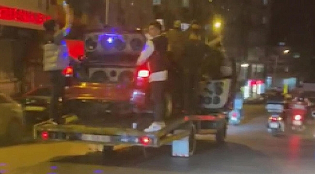Arnavutköy'de bir grup genç çekici üzerindeki bir otomobilin etrafında son ses müzik dinleyerek yolculuk etti. O anlar başka bir sürücü tarafından cep telefonu kamerasıyla kaydedildi.