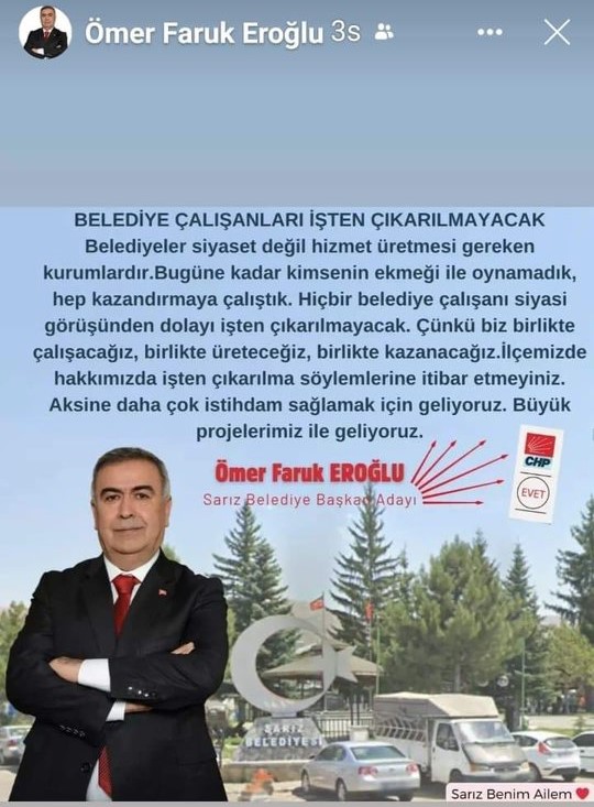 31 Mart 2024 Mahalli İdareler Genel Seçimleri’nde Sarız Belediye Başkanlığı için Cumhuriyet Halk Partisi Ömer Faruk Eroğlu’nu aday göstermişti. 31 Mart 2024 Mahalli İdareler Genel Seçimleri’nde Cumhuriyet Halk Partisi’nın adayı Ömer Faruk Eroğlu seçilerek Sarız Belediye Başkanlığı görevini devraldı. Sarız Belediye Başkanı Ömer Faruk Eroğlu, seçim öncesi belediyede çalışan hiçbir işçinin işine son vermeyeceğinin sözünü vermişti. Geçtiğimiz günlerde mazbatasını alarak göreve başlayan Başkan Eroğlu,24 işçinin iş aktine son verdiği, 14 işçiyi de ücretsiz izine çıkardığı iddia edildi. Sarız Belediye Başkanı Ömer Faruk Eroğlu’nun seçim öncesi sosyal medya hesabından da şu gönderiyi paylaşmıştı. İşte o gönderi: