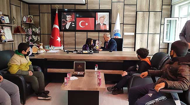 Akkışla'da 6-11 yaş aralığındaki İlçe Halk Kütüphanesini kullanan öğrenciler Belediye Başkanı Ayhan Arslan'ı ziyaret ederek; "Böylesine güzel hizmette emeğininiz geçtiği için teşekkür ederiz, Allah sizden razı olsun" dediler.