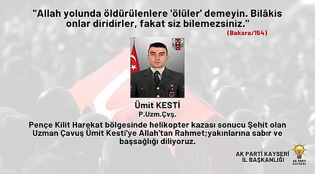 AK Parti Kayseri İl Başkanı Şaban Çopuroğlu, pençe-kilit operasyonu bölgesinde helikopter kazası sonrası şehit olan Uzman Çavuş Ümit Kesti için başsağlığı mesajı yayımladı.