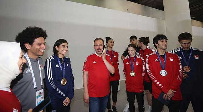 19. Akdeniz Oyunları'nda mücadele eden sporcuları izlemek için Cezayir'in Oran kentinde bulunan Gençlik ve Spor Bakanı Dr. Mehmet Muharrem Kasapoğlu, Kadın Milli Voleybol Takımı'nın İtalya ile oynadığı final maçını izledi.Maçın ardından müsabakaları biten Tekvando Milli Takımı'nı ziyaret eden Bakan Kasapoğlu, Cumhurbaşkanı Recep Tayyip Erdoğan ile telefonda görüştü. Telefonda, madalya alan sporcuları tebrik eden cumhurbaşkanı Erdoğan, "Hakan'ın altın kaçırışına doğrusu çok üzüldüm. İnşallah en yakın zamanda telafi eder" dedi.Cumhurbaşkanı Erdoğan, telefonda milli sporculara seslenirken şu ifadeleri kullandı:"Akdeniz Oyunları'nda bizi temsil eden sporcularımızı şahsım ve milletim adına en kalbi duygularla selamlıyorum. Şu an itibarıyla 42 altına ulaşmış vaziyetteyiz. Temennim odur ki oyunlar bitene kadar bu sayıyı biraz daha artırıp Akdeniz Oyunları'ndan lider olarak çıkalım. Bu liderlik sporcularımıza yakışır, bu millete çok yakışır. Tekrar şahsım ve milletim adına tüm sporcularımızı tebrik ediyorum, kutluyorum. İnşallah dönüşlerinde birlikte olmak üzere."