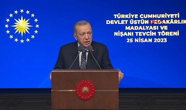 Cumhurbaşkanı Erdoğan'ın açıklamalarından satır başları;- Yerli yabancı toplam inşallah 55 bin kişiye madalya ve nişanları takdim edeceğiz. Burada bir hususun altını çizmemiz gerektiğine de inanıyorum. Bugün takdim ettiğimiz madalya ve nişanlar manevi birer hatıradır. Ülkemiz ve milletimiz adına edilmiş samimi bir teşekkürün ifadesidir. Fakat takdir ve taldifin asıl büyüğü sizlerin depremzedelerimiz başta olmak üzere 85 milyonun gönlünde edindiğiniz müstesna yerdir.- Asrın felaketi 6 Şubat depremleri sadece ülkemizin değil insanlık tarihinin en yıkıcı tabi afetlerinden biridir. Oldukça geniş bir alana yayılan ve 14 milyon vatandaşımızı etkileyen bu depremde 50 binin üzerinde vatandaşımız vefat etti. Sporcusundan siyasetçisine kadar nice insanımızı malesef kara toprağın bağrına verdik. Ardından yaşanan sellerde de toplam 21 vatandaşımız hayatını kaybetti.- Şu anda yaklaşık 3 buçuk milyon insanımızı geçici barınma tesislerinde misafir ediyoruz. Çadırların yanı sıra konteynerler ile barınma sorunlarını çözüyoruz. Tahrip olan alt yapı ve üst yapıyı yeniden elden geçiriyoruz. Bölgedeki 57 bin enkazdan 50 binini kaldırdık. İnşallah Hatay'daki enkazın kalanını da tasfiye edeceğiz. Nakdi yardım olarak 28 milyar lira ödeme yaptık. İlk kazmayı depremden sadece 15 gün sonra 21 Şubat tarihi itibariyle vurmuştuk. Bayramda da yapımı tamamlanan köy evlerimizi de ihtiyaç sahiplerine teslim ettik. Küçük sanayi bölgelerimizi de 6 bin yeni iş yeri ile ayağa kaldıracağız.