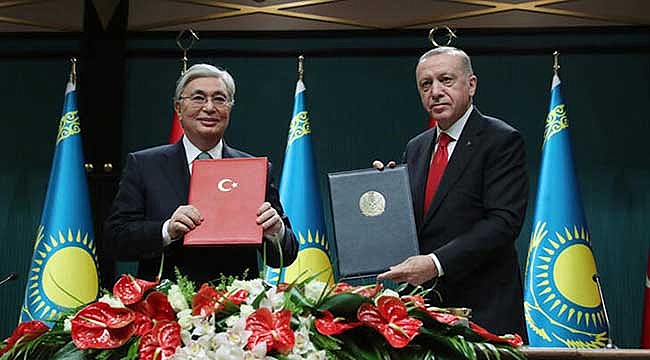 Yahya Kemal Beyatlı'nın Fuat Köprülü'ye 'Sen Ahmet Yesevi'ye bak. Bizim köklerimizi orada bulacaksın' dediği söylenir. Anadolu'yu bizlere vatan kılanlar, Hoca Ahmet Yesevi'nin hikmet ocağında pişen gönül erleridir. Piri Türkistan Yesevi Hazretleri'nin uyandırdığı çerağların ışığı asırlardır olduğu gibi bugün de yolumuzu aydınlatıyor" ifadelerini kullandı.'ÜZERİMİZE DÜŞENİ YAPMAYA HAZIRIZ'Kazakistan ile diplomatik ilişkilerin 30'uncu yıldönümü olduğuna işaret eden Cumhurbaşkanı Erdoğan, şöyle konuştu:"Az önce imzaladığımız ortak bildiri ile iş birliğimizi, geliştirilmiş stratejik ortaklık seviyesine yükselttik. Türkiye ile Kazakistan, gücünü müşterek tarih, dil, din ve kültür bağlarından alan köklü ilişkilere sahip iki kardeş ülkedir. Türkiye olarak Kazakistan'ın istikrarı ve huzuruna büyük önem veriyoruz. Ocak ayında Kazakistan'da yaşanan elim olaylardan hayatını kaybedenler için tekrar baş sağlığı ve yaralananlara acil şifalar diliyorum. Dostumuz, Kazakistan'ın bu badireden daha da güçlenerek çıktığına inanıyorum. Sayın Tokayev'in yeni Kazakistan'ın şekillenmesinde gösterdiği azim ve irade takdire şayandır. Bu kapsamda yürütülen kapsamlı reform hareketini destekliyoruz. Kazak kardeşlerimizin istikrarı, huzuru ve refahı için üzerimize düşeni yapmaya hazır olduğumuzun altını tekrar çizmek istiyorum. Gerek siyasi, gerek askeri, gerek ekonomik, gerek ticari, gerek kültürel her alanda biz bu dayanışmamızı sürdürerek geleceğe emin adımlarla omuz omuza yürüyeceğiz."'10 MİLYAR DOLAR HEDEFİNE ULAŞACAĞIZ'Erdoğan, Türkiye ve kazakistan arasındaki ticaret rakamlarına ilişkin, "Türkiye ile Kazakistan arasındaki ticaret hacmi, geçtiğimiz sene bir önceki yıla oranla yüzde 58 artarak 5,3 milyar doları aştı. Böylece 5 milyar dolar olarak belirlediğimiz hedefimizi kısa sürede geride bırakmış olduk. İnşallah birlikte atacağımız adımlarla aynı hızla 10 milyar dolar hedefine ulaşacağız. Yarın Türk iş adamlarıyla yapacağınız toplantının bu açıdan faydalı olacağına inanıyorum. Türk firmalarını liderliğinizdeki Kazakistan'a daha fazla yatırım yapmaya teşvik etmeyi sürdüreceğiz. Görüşmelerimizde ulaştırmadan karşılıklı yatırımlara, savunma sanayiinden enerji, eğitim ve kültüre kadar çok çeşitli alanlardaki geniş iş birliği potansiyelinden daha fazla faydalanma hususunda mutabık kaldık. Ayrıca bölgesel ve uluslararası meselelerde fikir teatisinde bulunduk. Özellikle Ukrayna'daki durumun bölgesel ve küresel etkilerini ele aldık. Yaklaşık 19,5 milyon nüfusa sahip Kazakistan'la, 85 milyon nüfusa sahip Türkiye'nin dayanışmasının ne kadar önemli olabileceğini takdir edersiniz. Özellikle krizin Ukrayna'nın egemenliği ve toprak bütünlüğü temelinde barışçıl yollarla çözülmesi yönündeki görüşlerimizin örtüştüğünü müşahede ettik. Bu savaş, Türk devletlerinin gerek ikili düzeyde gerek Türk Devletleri Teşkilatımız çatısı altındaki dayanışması ve iş birliğinin önemini bir kez daha gözler önüne sermiştir" açıklamasında bulundu. Tokayev ile Türk Devletleri Teşkilatı'nın yanı sıra Birleşmiş Devletler, İslam İşbirliği Teşkilatı ve Ekonomik İşbirliği Teşkilatı gibi platformlarda dayanışmayı sürdürme kararlılığını teyit ettiklerini bildiren Erdoğan, "Aramızda yine Stratejik İşbirliği Konsey Toplantımızı da inşallah ekim ayında Kazakistan'da gerçekleştireceğiz" dedi. TOKAYEV: TÜRKİYE, ÇOK ÖNEMLİ STRATEJİK ORTAKTIRKazakistan Cumhurbaşkanı Cömert Tokayev ise şu açıklamada bulundu:"Türkiye, Kazakistan için çok önemli stratejik ortaktır. Bugün Cumhurbaşkanı Sayın Recep Tayyip Erdoğan'ın ülkelerimizin ilişkilerini geliştirmeye yaptığı katkıyı yüksek olarak değerlendiriyorum. Halkımız adına memnuniyet duyduğumu belirtmek isterim. Altay'dan başlamış olan Kazak göçünün kutsal Anadolu topraklarına ulaşmasının bu sene 70'inci yıldönümü olduğunu belirtmek isterim. Kardeşlerimize dönemin Başbakanı Sayın Adnan Menderes kucak açarak karşılamıştı."