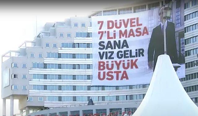 Cumhurbaşkanı Erdoğan temel atma töreni için bakanlara seslendiği sırada konuşma yaptığı yerin arka tarafında asılan bir pankarta dikkat çekti. "Buraya enteresan bir şey yazmışlar" diyen Erdoğan, "7 düvel 7'li masa sana vız gelir büyük usta demişler. Bu büyük ustanın yanında sizler oldukça durmak yok yola devam." ifadelerini kullandı.İşte Cumhurbaşkanı Erdoğan'ın dikkatini çeken pankart;