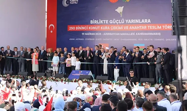 Ne diyorlardı; 'Hükümet bu enkazın altından kalkamaz.' Bu muhterislere rağmen azimle, sabırla, kararlılıkla çalışıyoruz. Her zaman söylüyorum; herkesin denizi, ufku kadardır. Her seçim döneminde bol keseden atıp tutan şimdi deprem bölgesinin yolunu hatırlayamayanların ufku da ancak sandıkları kadardır. İşleri bitince maalesef millet akıllarına dahi gelmiyor. Koltuk kavgasından, rant mücadelesinden başlarını bile kaldıramıyorlar. Biz 23 yıldır olduğu gibi yine sadece işimize bakıyoruz. Onlar umutsuzluk yayacak biz afetzede kardeşimizin umudu, yoldaşı, kader arkadaşı olacağız. Onlar 'Yapamazsınız' diyecek biz şehirlerimizi daha güçlü şekilde ayağa kaldıracağız. Onlar kavga ederken, boş beleş işlerle günlerini geçirirken biz Kahramanmaraş'la birlikte tüm Türkiye'ye aşkla 86 milyon olarak güçlü yarınlara yürüyeceğiz" dedi.Cumhurbaşkanı Recep Tayyip Erdoğan ve Azerbaycan Cumhurbaşkanı İlham Aliyev, Kahramanmaraş'ta yapımı tamamlanan Azerbaycan Mahallesi'nin açılışı ile 250 bininci Afet Konutu Anahtar Teslimi ve Kura Çekim Töreni'ne katıldı.Törene iki ülkenin Cumhurbaşkanlarının yanı sıra bakanlar, milletvekilleri, yerel yöneticiler, Demirören Holding Yönetim Kurulu Başkanı Yıldırım Demirören, Demirören Holding Yönetim Kurulu Üyesi Sinan Oktay, iş insanı Cemal Kalyoncu ve iş insanları ile davetliler katıldı.Azerbaycan Mahallesi'ndeki törende Çevre, Şehircilik ve İklim Değişikliği Bakanı Murat Kurum ile İçişleri Bakanı Ali Yerlikaya, deprem sonrası yürütülen çalışmalara ilişkin bilgiler verdi.