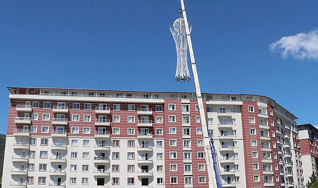 Depremde az hasar alan sitenin tepesindeki 5 tonluk demir paratoner, vinçle söküldü
