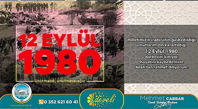 12 Eylül 1980 darbesinin 42. yılı nedeniyle Develi Belediye Başkanı Mehmet Cabbar sosyal medyadan mesajlar yayınladı.Develi Belediye Başkanı Mehmet Cabbar:" Milletimizin iradesinin gasbedildiği, umutlarımızın karartıldığı 12 Eylül darbesini kınıyor; hayatını kaybedenlere Allah'tan rahmet diliyorum." dedi.