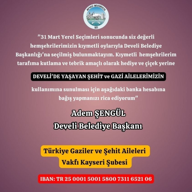 Develi Belediye Başkanı Şengül'ün çiçek yerine bağış çağrısı takdir topladı. 31 Mart yerel seçimlerini resmi sonuçlara göre Develi’de kazanarak belediye başkanı olarak seçilen Adem Şengül kutlama için çiçek göndermek yerine Türkiye Gaziler ve Şehit aileleri Vakfı'na bağış yapmalarını istedi.Cumhur ittifakı nin ortak adayı olarak Develi Belediye Başkanlığı seçimlerini kazanan Adem Şengül, göreve başlamadan anlamlı hareketlere imza atmaya başladı.31 Mart 2024 Pazar günü yapılan seçimlerde Develi