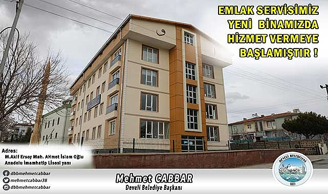 Develi Belediyesinin sosyal Medya hesabından yapılan paylaşımda, “Belediye binamız Mehmet Akif Ersoy Mahallesi Ahmed İslamoğlu Anadolu İmam Hatip Lisesi yanındaki binaya taşınacaktır. Mevcutta Emlak Servisimiz yeni hizmet binasında hizmet vermeye başlamıştır. Hemşerilerimize önemle duyurulur” ifadeleri kullanıldı.