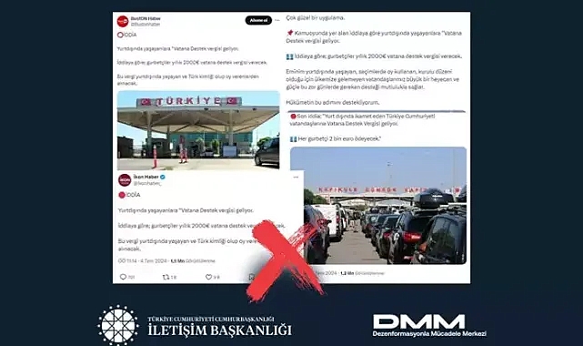 İletişim Başkanlığı Dezenformasyonla Mücadele Merkezi (DMM) "Hazine ve Maliye Bakanlığı tarafından hazırlanma aşamasında olan yeni vergi paketinde yurt dışında yaşayan vatandaşlarımıza herhangi bir başlık altında vergilendirme çalışması söz konusu değildir" açıklamasını yaptı.DMM'nin sosyal medya hesabından yapılan açıklamada, "Bazı sosyal medya hesaplarından paylaşılan, 'Gurbetçiler yıllık 2 bin Euro vatana destek vergisi verecek' iddiası doğru değildir. Hazine ve Maliye Bakanlığı tarafından hazırlanma aşamasında olan yeni vergi paketinde yurt dışında yaşayan vatandaşlarımıza herhangi bir başlık altında vergilendirme çalışması söz konusu değildir. Bahse konu yeni vergi paketine ilişkin piyasadaki paydaşlar tarafından Hazine ve Maliye Bakanlığı'na sunulan öneri ve beklentiler değerlendirilmekte olup, bakanlık tarafından son haline getirildikten sonra TBMM’ye sunulması planlanmaktadır. Vergide adaletin daha da pekiştirilmesi ve etkinliğin artırılması amacıyla hazırlanan yeni vergi paketine ilişkin ortaya atılan iddiaların, kamuoyunda tedirginlik ve güvensizlik oluşturmayı amaçladığı belirlenmiştir. Resmi kurum ve yetkililerin dışında yapılan spekülatif açıklamalara itibar etmeyiniz" denildi.