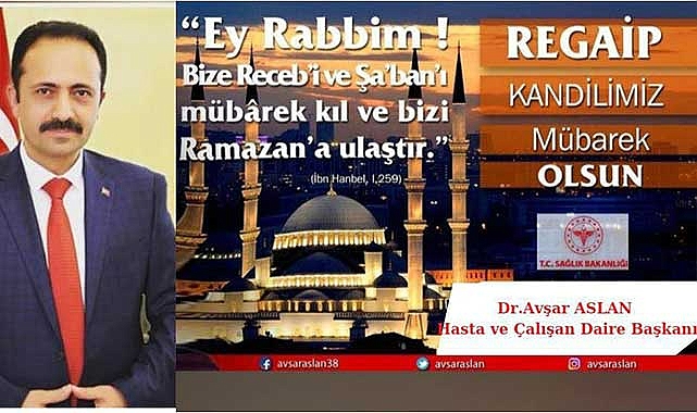 Sağlık Hizmetleri Genel Müdürlüğü Daire Başkanı Dr. Avşar Aslan, Regaip Kandili dolayısıyla bir mesaj yayımladı.