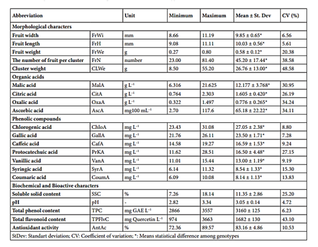 Tablo 3. Gilaburu Genotiplerinde araştırılan karakterler için tanımlayıcı istatistikler