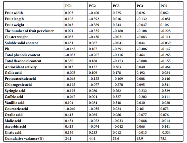 PCA sonuçlarına göre gözlenen değişkenlik ilk üç bileşen tarafından% 55,6 olarak açıklanmıştır. PC1, toplam varyansın % 24.1'ini oluşturuyordu ve çözünür katı madde içeriği, toplam flavonoid içeriği, oksalik asit, malik asit ve askorbik asit ile anlamlı şekilde ilişkilidir. Meyve boyu, meyve eni, meyve ağırlığı, salkım ağırlığı ve salkım başına meyve sayısı dahil olmak üzere beş karakter PC2'ye yerleştirildi ve toplam varyansın % 20,3'ünü açıkladı. Bu aynı zamanda PC1 ve PC2'de bulunan tanımlanmış özelliklerin, genotipleri birbirinden ayıran en belirgin özellikler olduğu anlamına gelir. Yüksek biyokimyasal birikim ile birlikte daha büyük meyve boyutları, gilaburunun ana üreme amacıdır. Bu bağlamda organik asitler bakımından zengin olan genotiplerin pomolojik özelliklerine ek olarak seçilmesinin akrabalıkta başarı getireceği söylenebilir (Tablo 4). Benzer gözlem ve bulgular Viburnum opulus L.’da Özrenk ve ark. (2020) tarafından rapor edilmiştir.