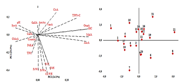 Genotiplerin incelenenlere göre dağılımı karakterler Şekil 1B'de verilmiştir. İncelenen tüm karakterler PCA kullanılarak görsel olarak genotiplere dağıtılabilir. Elde edilen sonuçlar, genotiplerin birbirinden ayıran farklı özellikleri nedeniyle farklı amaçlar için kullanılabileceğini göstermektedir. Örneğin, Genotip 8 ve Genotip 22, daha yüksek organik asitleri ve çözünür katı içeriği sayesinde endüstriyel ürün işleme için uygundur.