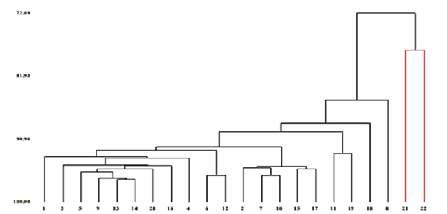 Şekil 2. İncelenen gilaburu genotiplerinin Öklid mesafeleri kullanılarak morfolojik ve biyokimyasal özelliklere dayalı küme analizi.
