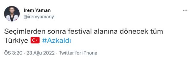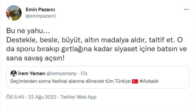 Twitter hesabından "Seçimlerden sonra festival alanına dönecek tüm Türkiye" twitti atan İrem Yaman, Akşam gazetesi yazarı Emin Pazarcı'dan tepki aldı. Akşam gazetesi yazarı Emin Pazarcı ise İrem Yaman'a yanıt olarak:" Bu ne yahu... Destekle, besle, büyüt, altın madalya aldır, taltif et. O da sporu bırakıp gırtlağına kadar siyaset içine batsın ve sana savaş açsın!" dedi.