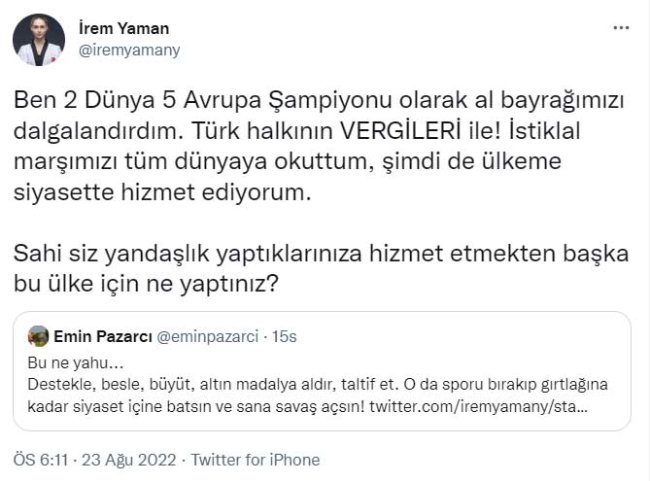 Tarafların bu sözlü atışması sosyal medyada gündem oldu. Daha fazla dayanamayan İrem Yaman şu twitti attı:" Ben 2 Dünya 5 Avrupa Şampiyonu olarak al bayrağımızı dalgalandırdım. Türk halkının VERGİLERİ ile! İstiklal marşımızı tüm dünyaya okuttum, şimdi de ülkeme siyasette hizmet ediyorum. Sahi siz yandaşlık yaptıklarınıza hizmet etmekten başka bu ülke için ne yaptınız?"