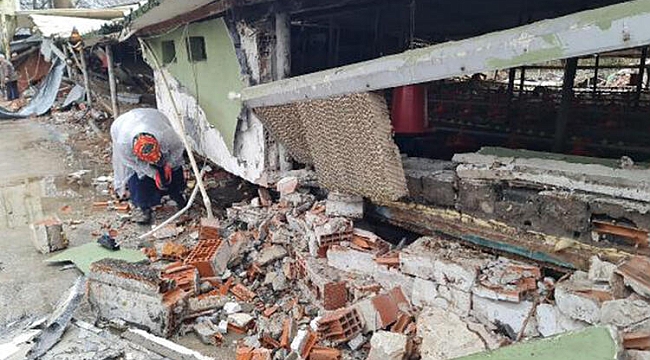 Dün yapılan çalışmalarda 30 binden fazla civciv kurtarıldı. Mahsur kalan civcivleri kurtarmak için iş makinesi ile enkaz kaldırılırken, çiftlik çalışanları da çevrede canlı kalan civcivleri kafeslere topluyor.