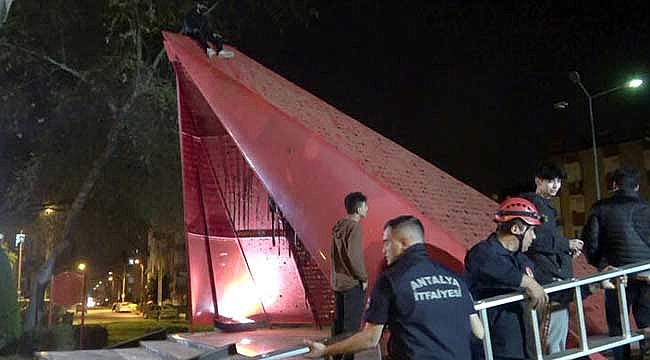 Olay, dün saat 23.00 sıralarında Muratpaşa ilçesi, Bayındır Mahallesi, Palmiye Caddesi'nde meydana geldi. 'Eğlence olsun' diyerek arkadaşları ile birlikte 'Al yazmalım' anıtına çıkan Mehmet Cemal Can Polat, yükseklik korkusu nedeniyle inemeyince mahsur kaldı. Polat’ı indirmek için çaba sarf eden arkadaşları başarılı olamayınca 112 Acil Çağrı Merkezi'nden yardım istendi. İhbar üzerine adrese itfaiye ekipleri, sevk edildi. Gelen ekipler, Polat'ı merdiven uzatarak anıttan inmesini sağladı. Ekiplere teşekkür eden Polat, evine gitti.