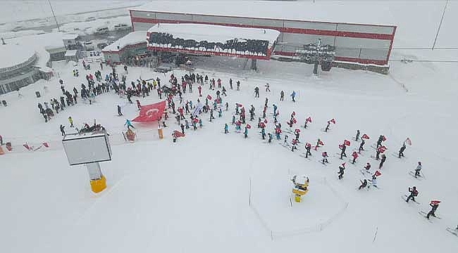 Etkinlik kapsamında JAK timi ve kayakçılar, açtıkları Türk Bayrağı ile zirveden tören alanına indiler.