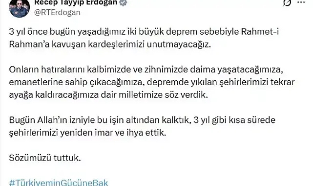 Cumhurbaşkanı Erdoğan, sanal medya hesabından yaptığı paylaşımda, "3 yıl önce bugün yaşadığımız 2 büyük deprem sebebiyle Rahmet-i Rahman'a kavuşan kardeşlerimizi unutmayacağız. Onların hatıralarını kalbimizde ve zihnimizde daima yaşatacağımıza, emanetlerine sahip çıkacağımıza, depremde yıkılan şehirlerimizi tekrar ayağa kaldıracağımıza dair milletimize söz verdik. Bugün Allah'ın izniyle bu işin altından kalktık, 3 yıl gibi kısa sürede şehirlerimizi yeniden imar ve ihya ettik. Sözümüzü tuttuk" ifadelerini kullandı.
